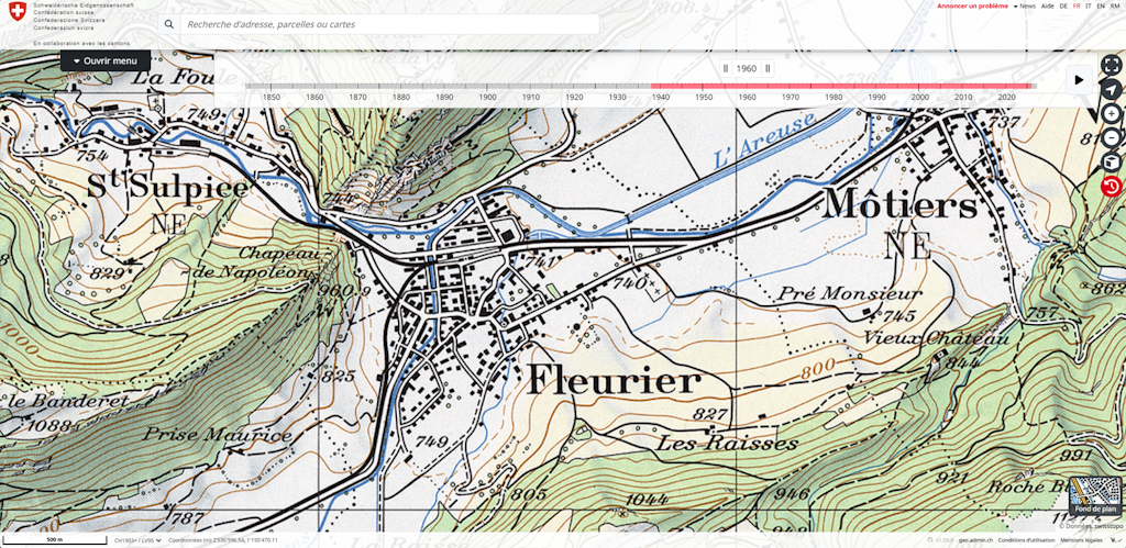 La funzione di viaggio nel tempo è ora disponibile per la carta nazionale a 1:50'000. Analizzate l'evoluzione del paesaggio svizzero dal 1938 ad oggi sul visualizzatore di carte map.geo.admin.ch o tramite i geoservizi dell'Infrastruttura federale di dati geografici.