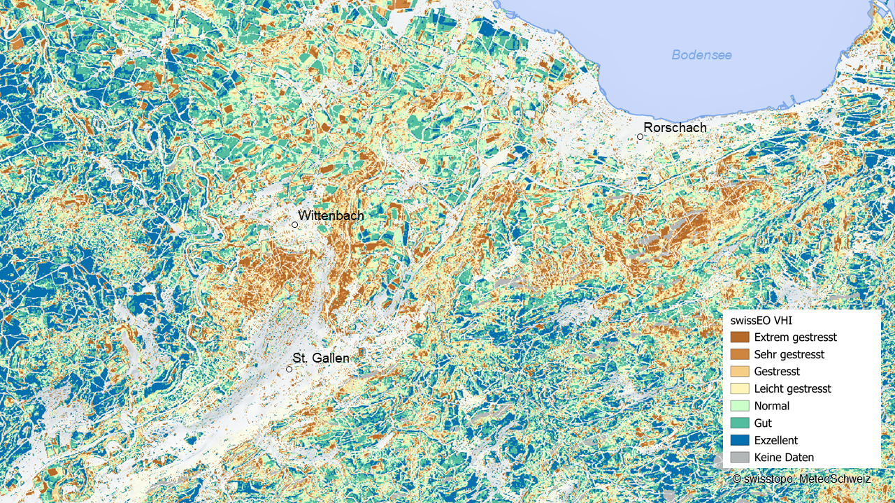 Stato di salute della vegetazione nella regione di San Gallo («swissEO VHI» del 15 aprile 2023). Questa carta combina i dati satellitari di Sentinel-2 e Meteosat e mostra la vegetazione stressata da fattori quali siccità, malattie, abbattimento da vento o interventi umani rispetto al periodo di riferimento climatico 1991-2020.