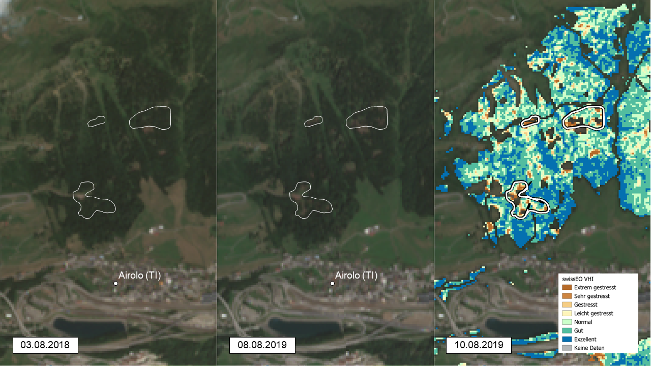 Tempesta Vaia sopra Airolo (Ticino, 29/30.10.2018) – A sinistra: immagine a colori reali di Sentinel-2 prima della tempesta (agosto 2018). Al centro: immagine dopo la tempesta (agosto 2019) con contorni delle aree danneggiate. A destra: indice di salute della vegetazione (VHI) dopo l’evento (agosto 2019), con segnale di stress per le aree forestali colpite dalla tempesta.