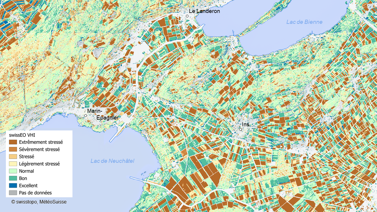 Stato di salute della vegetazione nell'Altipiano bernese («swissEO VHI» del 5 agosto 2018). Questa carta sovrapposta combina i dati satellitari di Sentinel-2 e Meteosat e mostra la vegetazione stressata da fattori quali siccità, malattie, abbattimento da vento o interventi umani rispetto al periodo di riferimento climatico 1991-2020.