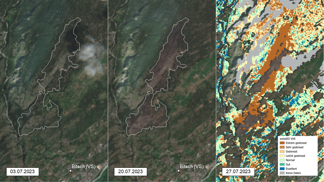 Incendio boschivo sopra Bitsch (Vallese, 17.07.2023) – A sinistra: immagine a colori reali di Sentinel-2 prima dell’incendio (inizio luglio). Al centro: situazione dopo l’incendio (fine luglio) con contorno dell’area bruciata. A destra: indice di salute della vegetazione (VHI) dopo l’evento, con segnale di stress estremo per il bosco nell’area bruciata.